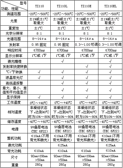 - 關(guān)鍵參數(shù):測(cè)溫范圍:-20℃-500℃;測(cè)量精度:讀數(shù)值的±1%或±1℃;重復(fù)精度:讀數(shù)值的±1%或±1℃.