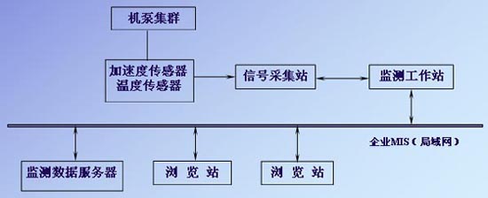 系統(tǒng)是一種分布式網(wǎng)絡(luò)型遠(yuǎn)程數(shù)據(jù)采集分析系統(tǒng)。其中,現(xiàn)場信號采集站安裝在現(xiàn)場,每個現(xiàn)場信號采集站負(fù)責(zé)采集多臺機(jī)泵的振動和溫度信號?,F(xiàn)場信號采集站與監(jiān)測工作站之間采用網(wǎng)絡(luò)形式通訊,采用TCP/IP通信協(xié)議,可以遠(yuǎn)距離通暢傳輸數(shù)據(jù)。系統(tǒng)現(xiàn)場信號采集站數(shù)量不限,數(shù)據(jù)傳輸速率最高可達(dá)10M/100MBbps,用來傳輸系統(tǒng)設(shè)置信息、測量信號數(shù)據(jù)、波形、信號報警信息等。監(jiān)測工作站可以通過企業(yè)MIS網(wǎng),實現(xiàn)機(jī)泵運行數(shù)據(jù)的網(wǎng)上共享,相關(guān)部門和人員都可以使用網(wǎng)絡(luò)瀏覽器觀察現(xiàn)場機(jī)泵的運行數(shù)據(jù)。