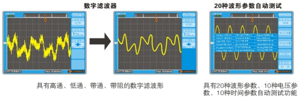 ▲多種自動(dòng)測量功能Vpp,Vamp,Vrms,Vmax,Vmin,Vtop,Vbase,Vavg,Freq,Period,Risetime,Falltime, +Width,-Width,Overshoot,Preshoot,+Duty,-Duty,etc.