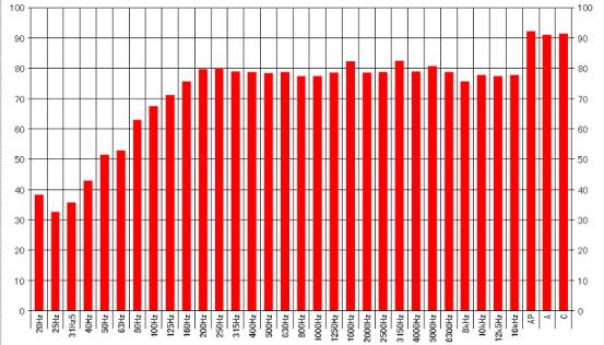 8. 頻譜特性: 見圖(輸入白噪聲,消聲室內(nèi)距聲源中心