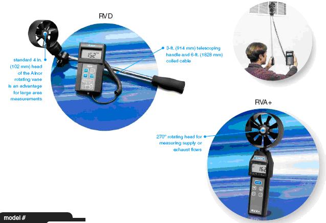 旋轉(zhuǎn)葉片風速計可測量真實空氣速度,讀物無需進行密度校正因子修正。 RVA+ 的用戶可通過按單側(cè)按鈕并對被測量區(qū)域進行“掃描”而獲得面積平均流量。 RVD 提供了伸長測量以及數(shù)據(jù)記錄、調(diào)用和下載功能。