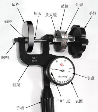 本儀器的設(shè)計(jì)符合洛氏硬度試驗(yàn)的基本定義。與臺(tái)式機(jī)的主要不同點(diǎn)是:其試驗(yàn)力的施加是通過(guò)螺桿和一個(gè)已校準(zhǔn)的彈簧完成的;用刻度表測(cè)量彈簧位移來(lái)確定試驗(yàn)力的大小;壓痕深度的測(cè)量由精密螺旋測(cè)微機(jī)構(gòu)完成,硬度值的讀取方式是透過(guò)放大鏡讀取鼓輪上的刻度線。本儀器的結(jié)構(gòu)如上圖所示