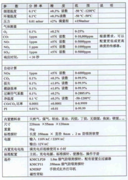 • 關鍵參數(shù):KM940手持式多組分煙道氣體分析 用于鍋爐的燃燒測試和煙氣污染排放監(jiān)測 可同時測量O2和3個污染氣體以及煙氣溫度,環(huán)境溫度,煙道壓力.傳感器 SO2, CO, NO, NO2 任選1-3個靈活組合
