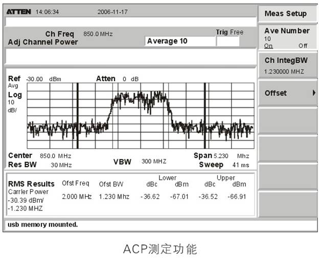 ·相鄰頻道功率(ACP)測(cè)試:是測(cè)試在使用多重頻道的移動(dòng)通信系統(tǒng)上的傳送電力對(duì)相鄰頻道所起到的影響或者與相鄰頻道之間的電力比率??梢栽谝粋€(gè)屏幕上查看所有測(cè)試值以及波形。