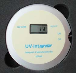 UV能量計(jì)( UV-Int150+ ): UV-int150+耐高溫UV能量計(jì)是一種高質(zhì)量的UV能量測(cè)量?jī)x。UV能量計(jì)是用于測(cè)量UV固化裝置的UV能量的一種儀器,測(cè)量?jī)x的主感器在測(cè)量?jī)x的背面,測(cè)量范圍為250~410納米,測(cè)量時(shí)可直接顯示于能量計(jì)正面的顯示屏上讀出(單位:毫焦耳/平方厘米),該能量計(jì)的電源為3.6伏特殊耐高溫125度電池,該電池由于使用了特別的能源節(jié)省線路,該電池可持續(xù)大約5000小時(shí)。