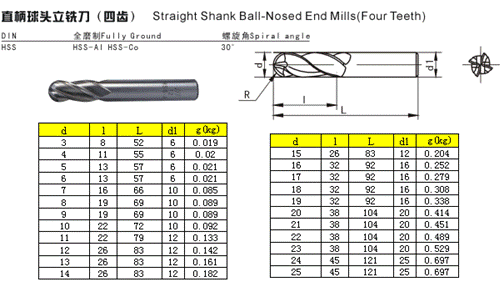 - 儀器名稱:直柄球頭立銑刀(四齒)